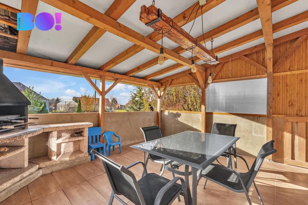 Na rodinný dům navazuje terasa pro grilování a odpočinek, zahrada o ploše 1125 m² s bazénem.