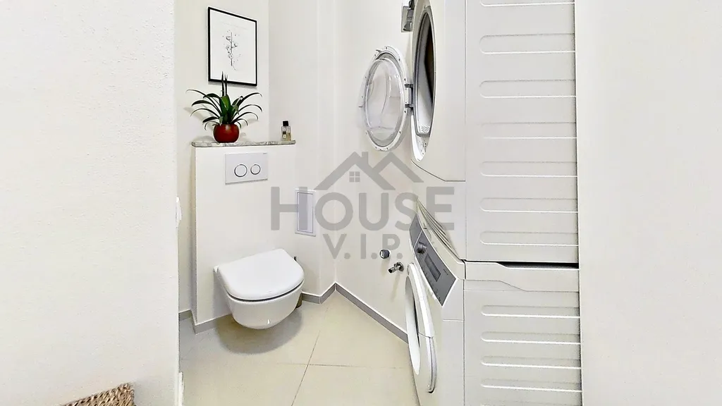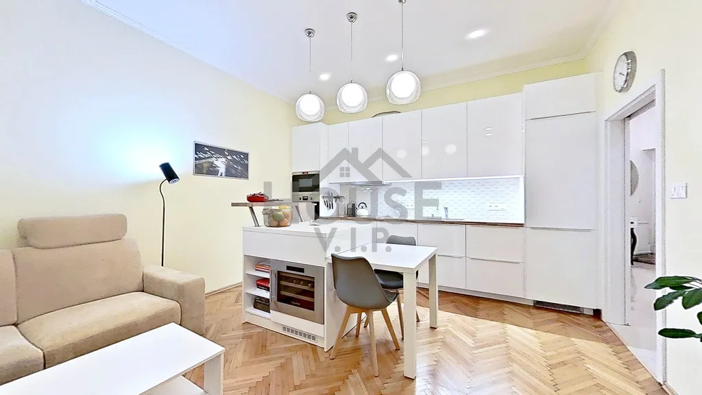Moderní kuchyňská linka je plně vybavena vestavnými spotřebiči, včetně indukční varné desky a vinotéky. Jídelní stůl je prakticky rozkládací až pro 4 osoby. Po dohodě je možné v bytě ponechat většinu vybavení z fotografií.