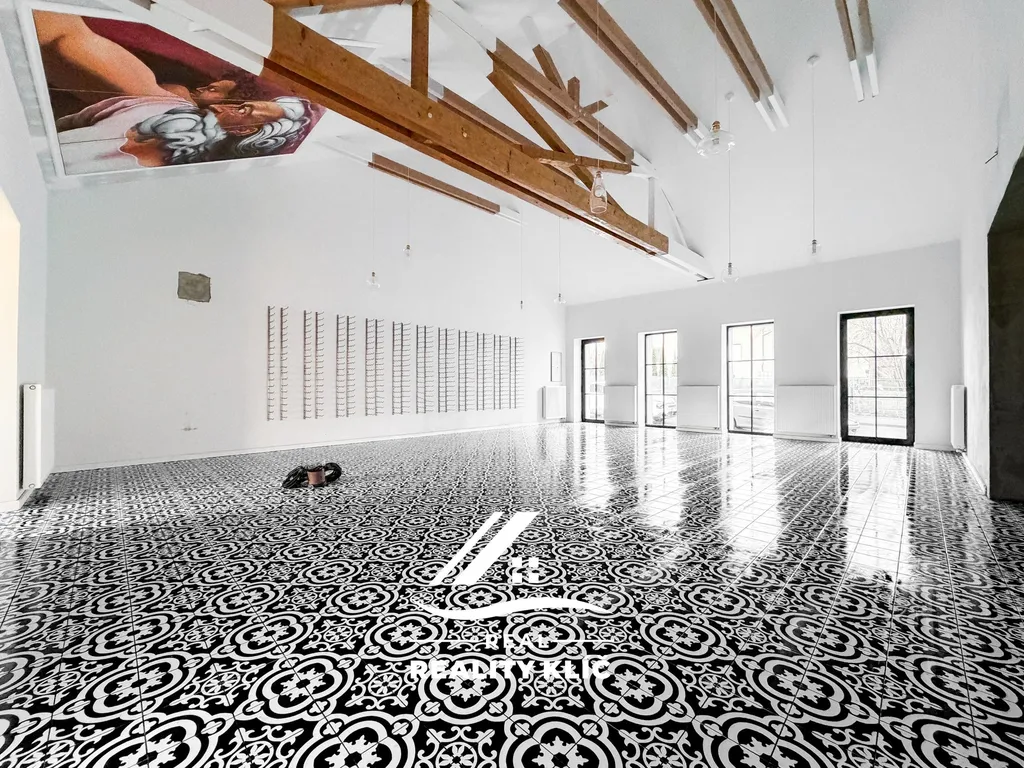 V přízemí původní části budovy se nachází hotový, reprezentativní prostor s vysokým stropem, odkrytými dřevěnými trámy a originálními výtvarnými detaily, které prostoru dodávají výrazný charakter. Velká okna, keramická dlažba a přímý vstup z ulice vytváří ideální prostředí pro restauraci, kavárnu, showroom, galerii nebo jinou komerční činnost. Součástí tohoto podlaží je i prostor vhodný jako kuchyňské či technické zázemí.