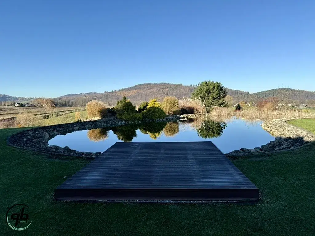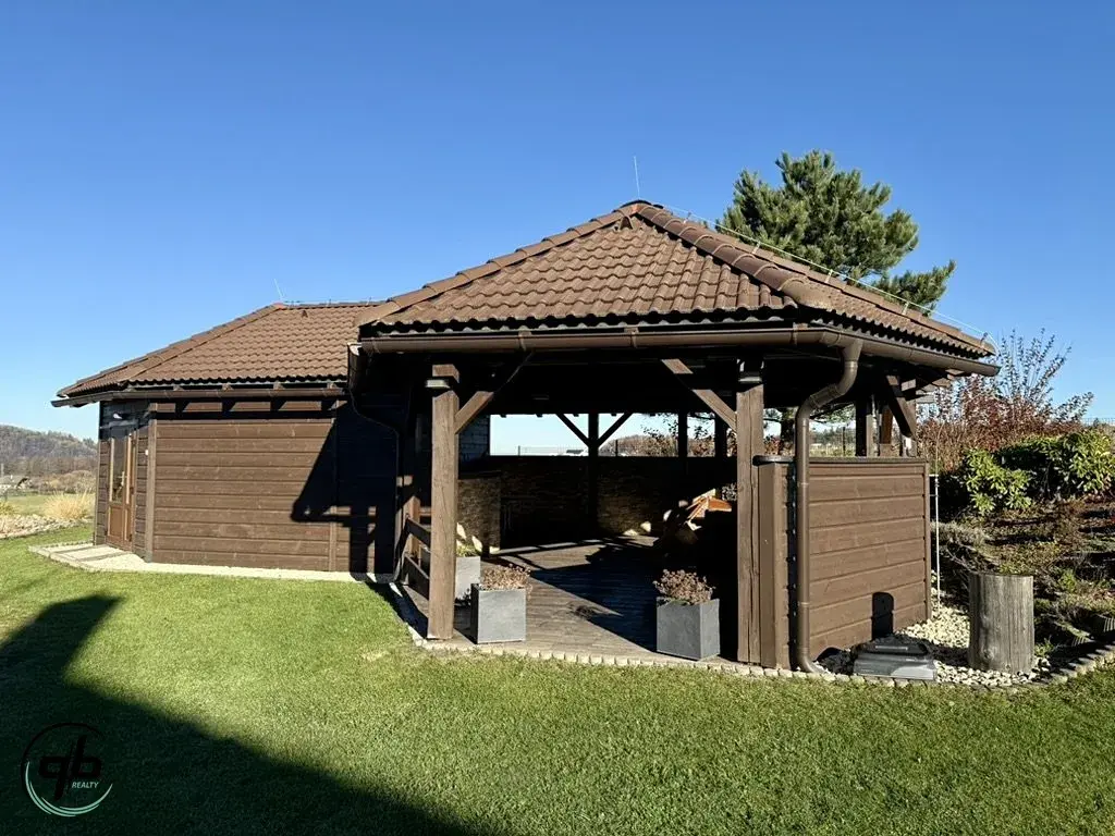 Velkou přidanou hodnotou domu je kompletně oplocená, obrovská vzrostlá zahrada s koupacím jezerem o výměře 336 m2 a zahradním domkem, jehož součástí je pergola s letní kuchyní, kryté posezení a úložný prostor na zahradní techniku. O zahradu se stará robotická sekačka, dimenzovaná na celou výměru zatravněné plochy a v jezeru je pak umístěn robotický sběrač nečistot, takže vy jen pozorujete, jak je o vše perfektně postaráno. Pro milovníky psů je na zahradě umístěn prostorný kotec, nechybí ani ohniště a spousta zákoutí se vzrostlými stromy. Příjezd k domu přes automatickou bránu. Dům má pouze jednoho souseda, který nemovitost trvale neobývá. Součástí prodeje je i příjezdová asfaltová komunikace a kamenný most.