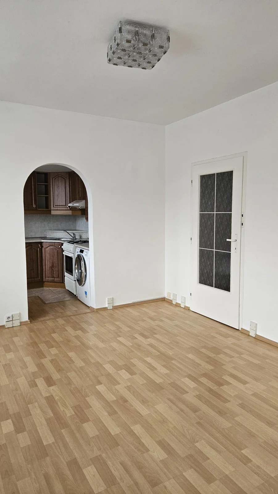 Přes obývací pokoj vstup do ložnice a do kuchyně. Na podlaze plovoucí podlaha.