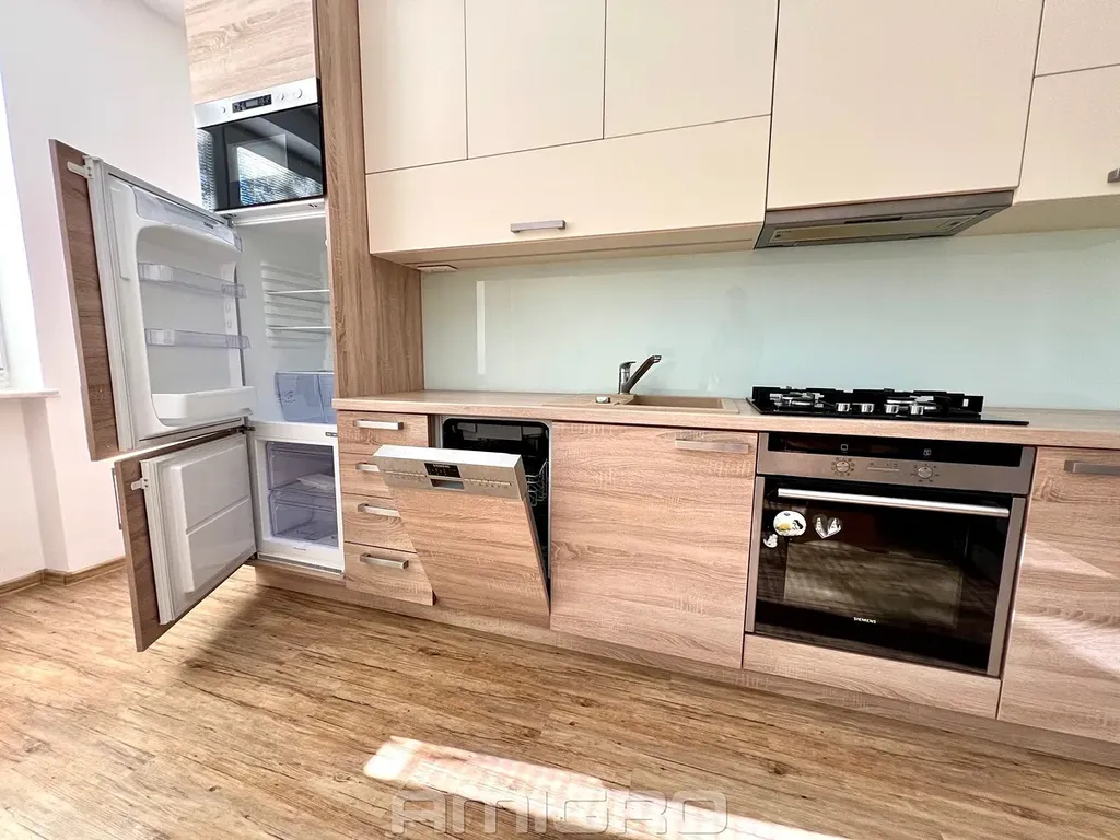 Byt se k podnájmu nabízí částečně vybavený - kuchyňská linka se spotřebiči (vestavná chladnička, mrazák, myčka nádobí, plynová varná deska, elektrická trouba, mikrovlnná trouba, digestoř), dále sedačka, pračka, vestavná skříň v ložnici a předsíňová stěna.
