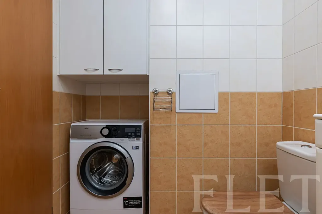 Kuchyňská linka je vybavena spotřebiči: lednice s mrazákem, myčka, elektrická trouba i mikrovlnná trouba. V koupelně najdete vanu pro příjemný relax i pračku, takže máte vše potřebné pro pohodlný každodenní provoz. Praktickým benefitem je i dostatek úložných možností, které pomáhají udržet byt vzdušný a uklizený.