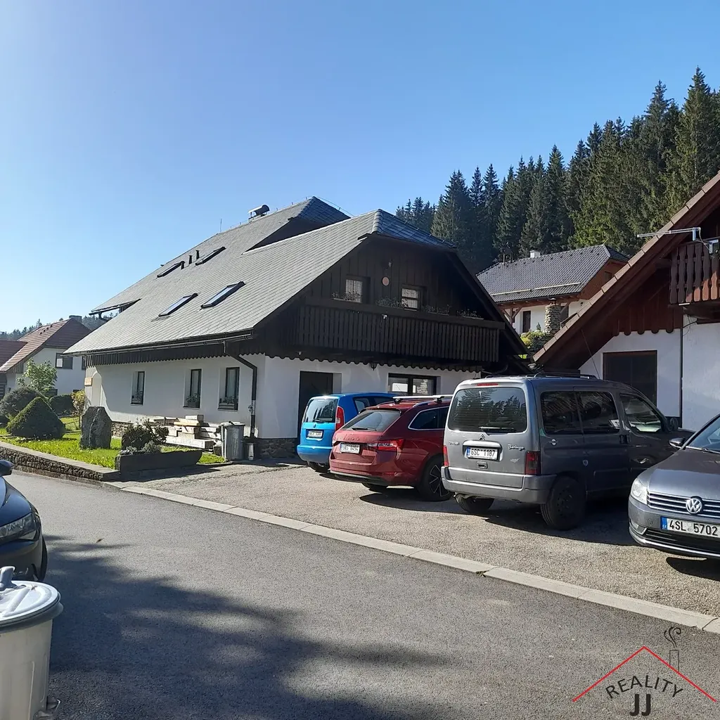 Pension - apartmánový dům je situován u hlavní komunikace -příjezdové asfaltové cesty, kde je k dispozici celkem šest parkovacích míst. Jedná se o zděnou stavbu, částečně obloženou dřevem se zastavěnou plochou 250m2 , zkolaudovanou jako ubytovací zařízení o kapacitě 16 pokojů a až 22 lůžek.