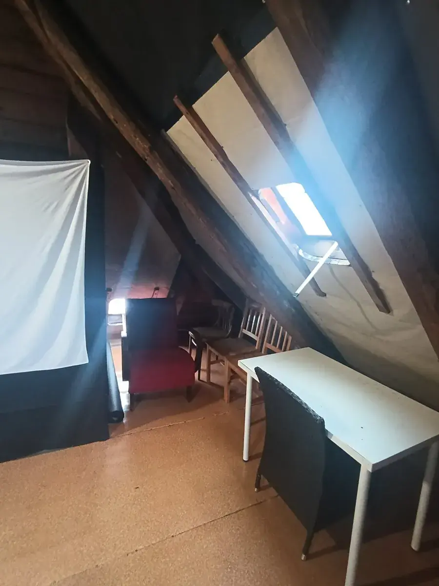 Z chodby (společná pro dva byty), kterou lze využít jako předsíň, se vchází do hlavní místnosti. Ta se člení na obývací část a kuchyňský sektor. Kuchyňský sektor je oddělen od obytné části jídelním stolem a židlemi. Vstup do koupelny se nachází na rozmezí kuchyně a obývací části. Koupelna s oknem je vybavena sprchovým koutem, WC a automatickou pračkou. Na protilehlé straně bytu je situován vstup do malé podkrovní ložnice s přiznanými trámy – viz foto. Nad bytem je vlastní půdní pokoj, možnost jako ateliér či odkládací prostor.
