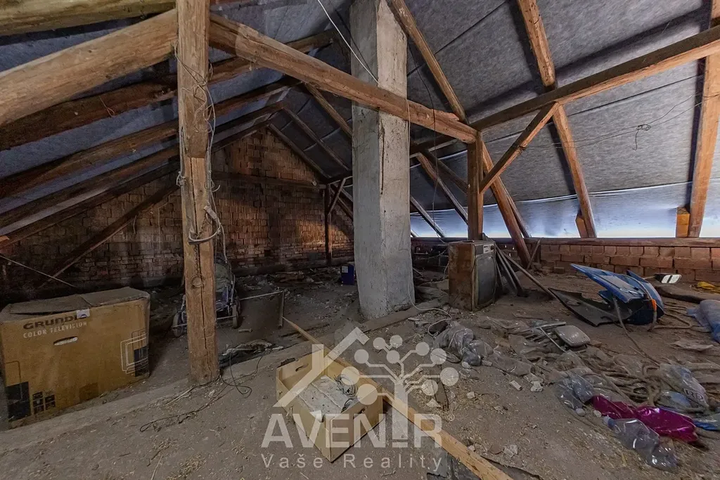 Dům disponuje rozsáhlou půdou, která nabízí možnost vybudování podkrovního bydlení a tím výrazně navýšit obytnou plochu. Součástí nemovitosti je také samostatná část domu, původně využívaná jako vejminek – dva pokoje oddělené průjezdem. Tento prostor je ideální pro vícegenerační bydlení, samostatné bydlení pro starší děti, případně jako komerční nebo podnikatelské prostory.