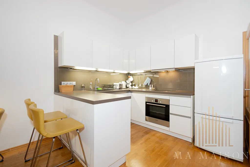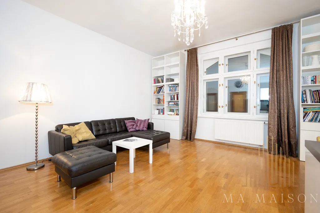 Byt o velikosti 74 m² se nachází ve 2. patře historického činžovního domu s výtahem. Sestává z prostorné předsíně, koupelny s toaletou, ložnicí a obývacím pokojem, který je spojený s kuchyňskou linkou. Kuchyňská linka je kompletně vybavená vč. všech spotřebičů - tj. varná deska, digestoř, trouba, lednice s mrazákem a myčka. Součástí linky je kuchyňský bar s barovými židlemi. Součástí je rovněž jídelní stůl s jídelními židlemi. Kuchyň je kompletně vybavená potřebným nádobím. Obývací pokoj je dále vybaven koženou sedací soupravou, konferenčním stolkem a knihovnami. Ložnice je vybavena vestavnou šatní skříní, manželskou postelí vč. matrací a roštů. Dále noční stolky, lampy a líčící stolek. Koupelna je vybavena sprchovým koutem / vanou, pračkou, toaletou, umyvadlem se zrcadlem. Chodba v bytě je vybavena vestavnou šatní skříní, komodami a botníkem.