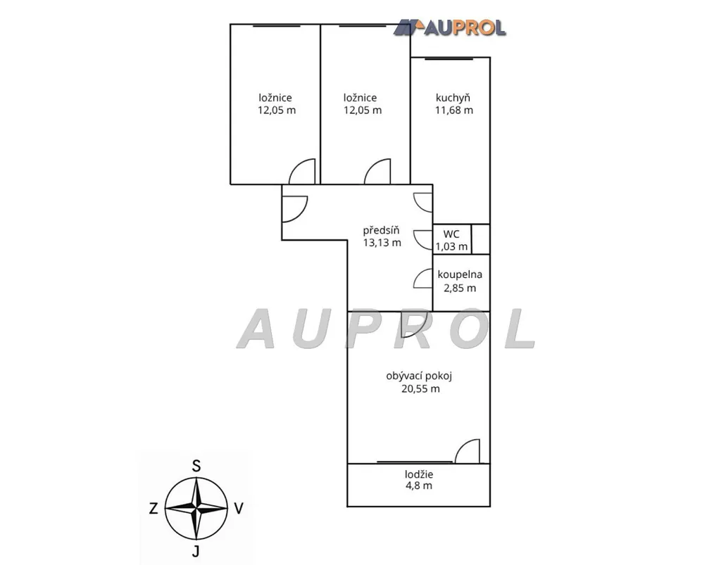 DISPOZICE – předsíň 13,13 m², obývák 20,55 m², lodžie 4,8 m², ložnice 12,05 m², 2. pokoj 12,05 m², kuchyň 11,68 m², koupelna 2,85 m², WC 1,03 m², sklep 2 m²