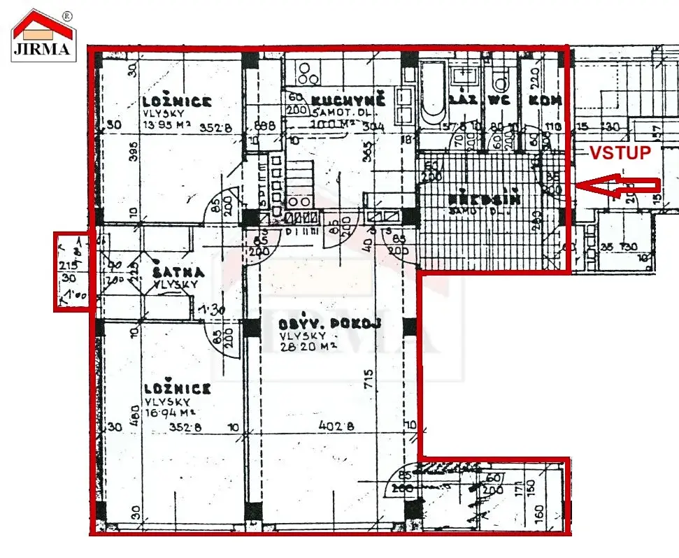 Dispozice bytu: předsíň, komora, WC, koupelna se sprchovým koutem, kuchyně, spíž, obývací pokoj se vstupem na lodžii, chodba se šatnou a vstupem na balkon, dětský pokoj, ložnice.