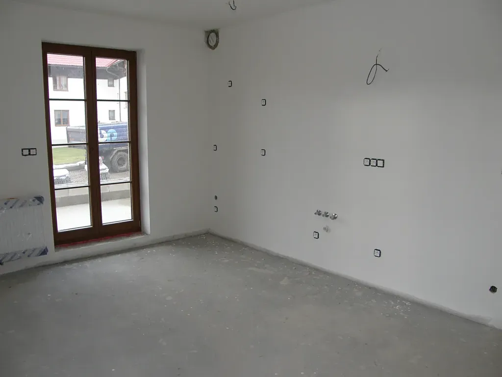 Aktuality z výstavby domu: byla dokončena venkovní fasáda domu, provádí se modelace příjezdové komunikace a v bytech se provádí práce na koupelnách a kompletace bytů.