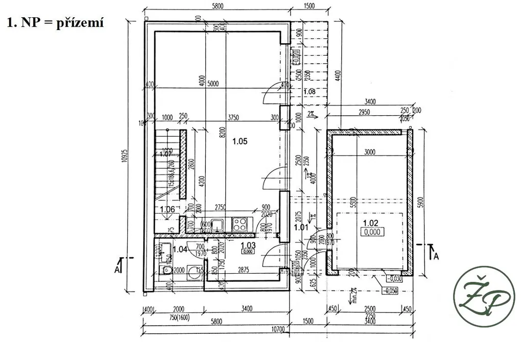 Dispozice: 1. NP (přízemí) = zádveří, jež vyúsťuje na terasu a zahradu; vstupní hala ze které je přístup na toaletu (vybavena pračkou a sušičkou); dále je z haly přístupný prostorný obývací pokoj (35.75m2), který je spojen s kuchyní, spižírnou a jídelnou. Kuchyně je nadstandardně vybavena těmito spotřebiči: Aquaphor – reverzní osmotický filtr pitné vody, indukční varná deska, digestoř, trouba, myčka nádobí, lednice s mrazničkou, mikrovlnná trouba. Z obývacího pokoje je 2x vstup na terasu a zahradu přes francouzské dveře.