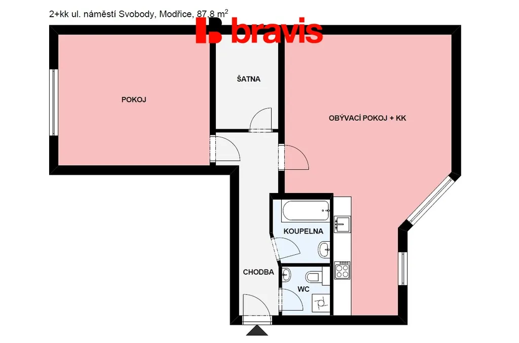 Nabízíme k pronájmu prostorný byt o dispozici 2+kk s celkovou užitnou plochou 87,8 m², situovaného ve 2. nadzemním podlaží cihlového domu z roku 2008 na ulici náměstí Svobody v žádané lokalitě Modřice, Brno - venkov, jen 3 km od Olympie Brno.
