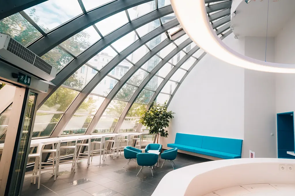 V přízemí budovy je reprezentativní recepce se security službou, lobby pro návštěvníky a obchodní prostory. Výtahem nebo po schodišti jsou dostupné kanceláře ve vyšších patrech. Celá budova prošla renovací, nabízené kanceláře jsou připraveny vyklizené a vymalované. Standardem jsou klimatizace a vstup pro zaměstnance přes čipovou kartu nebo služba zajišťující úklid společných prostor.