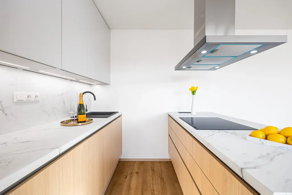 Dominantou bytu je prostorný obývací pokoj s kuchyní na míru a moderním ostrůvkem o celkové ploše 33 m². Kuchyň je plně vybavena vestavnými spotřebiči (elektrická trouba, mikrovlnná trouba, indukční deska, myčka nádobí) a přirozeně navazuje na obytný prostor. Koupelna je řešena velmi velkoryse – nabízí vanu, samostatný sprchový kout, podlahové vytápění s digitálním termostatem, elegantní topný žebřík i designové umyvadlo se skříňkou.