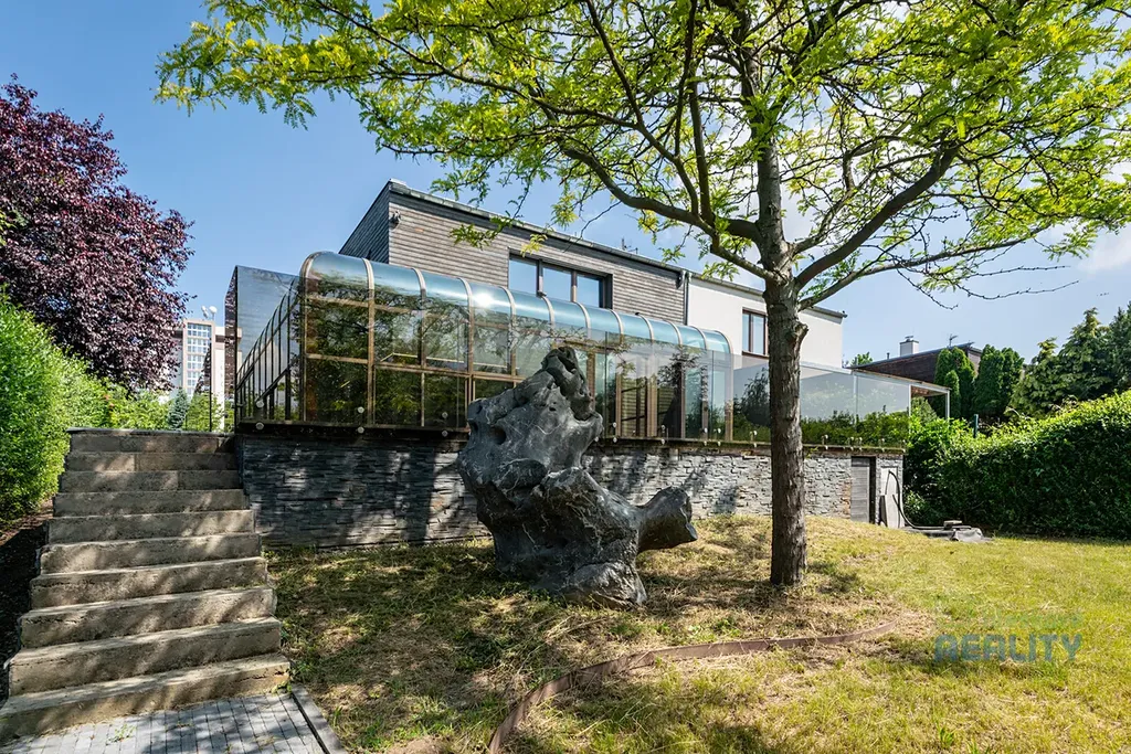 Ze zimní zahrady se vstupuje na prostornou terasu (37 m²), která navazuje na pečlivě upravenou zahradu s připraveným japonským jezírkem. Pod terasou se nachází jímka na dešťovou vodu, technické zázemí pro vířivku a prostor na zahradní vybavení.