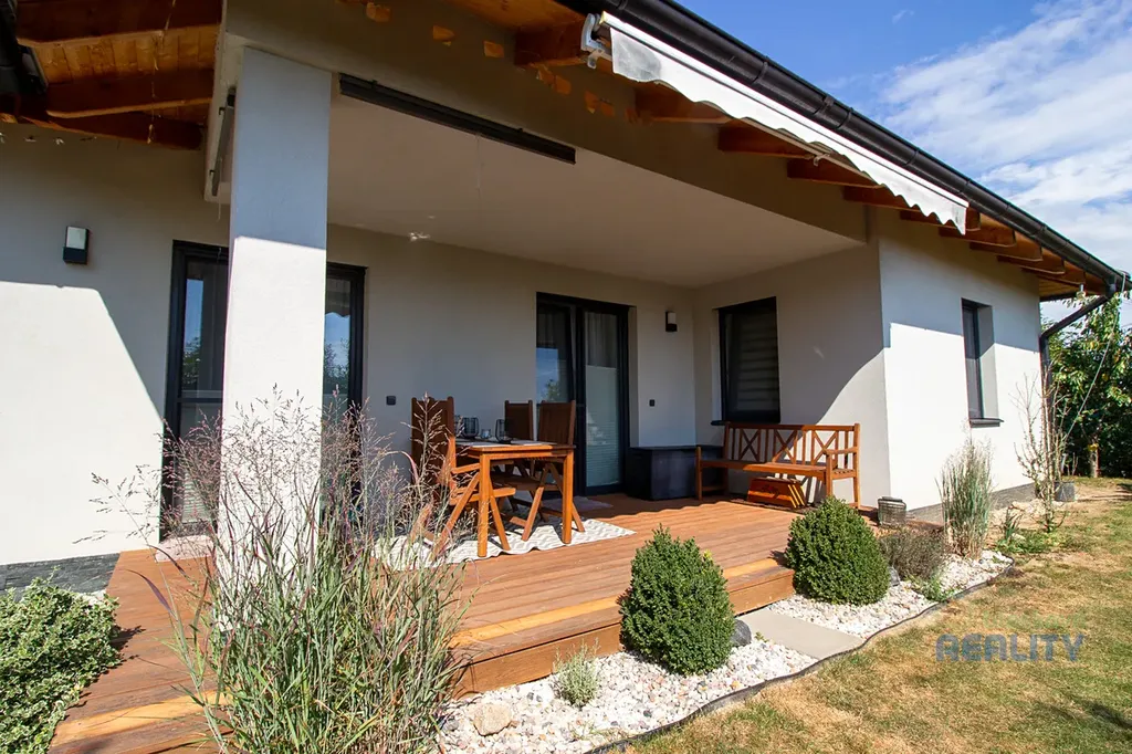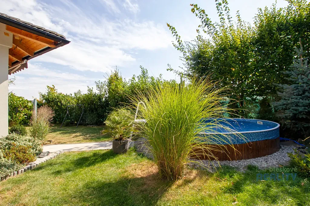 Zahrada je pečlivě udržovaná, najdete zde ovocné stromy (jabloň, třešeň), okrasné dřeviny i keře. Součástí je terasa s posezením, bazén pro letní osvěžení, zahradní domek na nářadí, přístřešek pro auto či karavan a prostorná garáž. Vjezd zajišťuje elektrická brána.