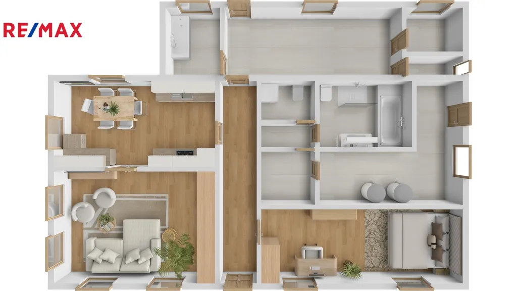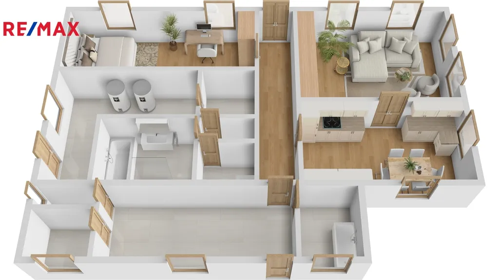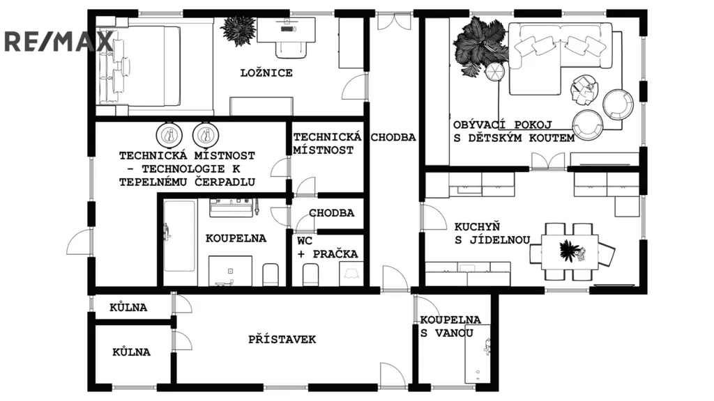 Veranda, technická místnost 1 s vanou, vstupní chodba, kuchyň s jídelnou a obývacím koutem, dětský pokoj, ložnice, koupelna se sprchovým koutem a vanou, WC samostatné s umývadle, technická místnost 2 , technická místnost 3 s akumulačními nádobami a technologií k tepelnému čerpadlu.