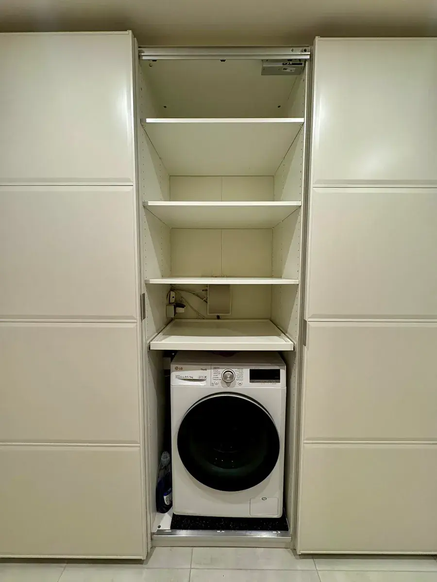 V chodbě je po celé délce umístěna praktická vestavná skříň, která kromě velkorysého úložného prostoru skrývá také pračku kombinovanou se sušičkou.