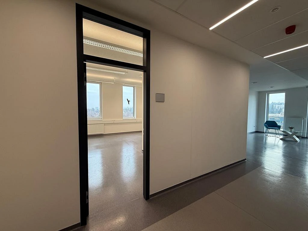 Prostory nalezneme v pátém patře budovy. Jsou krásně prosklené a je z nich nádherný výhled. Působí, stejně jako budova, moderním dojmem a jejich celková plocha činí 38,2 m². Jedna kancelář má celkovou plochu 18,20 m² a druhá celkovou plochu 20 m². Jedna z kanceláří je vybavena světlým nábytkem, který působí vzdušně a moderně, druhá z kanceláří je nevybavená. V kancelářích se nachází moderní elektronické zařízení na rozsvícení prostoru a regulaci teploty. V kancelářích jsou instalovány venkovní žaluzie. Na chodbě jsou společné prostory jako je WC nebo velmi praktická společná kuchyňka, která je vybavená lednicí, mikrovlnnou troubou, varnou konvicí, dřezem a varnou deskou, vybavení je určeno ke společnému užití na patře budovy. V budově je také zasedací místnost, kterou si lze pronajmout.