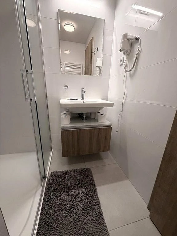 Vchodovými dveřmi vejdeme do vstupní chodby o výměře cca 4,3 m², ve které se nachází po celé její délce vestavná skříň na míru se zabudovaným bojlerem pro ohřev teplé vody. Hlavní obytná část o výměře cca 21,8 m² slouží jako kuchyně a obývací pokoj s ložnicí zároveň. Tato místnost je plně vybavena kuchyňskou linkou se čtyř plotýnkovou sklokeramickou deskou značky Elektrolux, digestoří, dřezem a lednicí s mrazákem. V pokoji je jídelní stůl se čtyřmi židlemi zajišťující komfortní stolování až čtyř osob. Nad stolem jsou dvě krásné designové lampy. V pokoji je dvojlůžko s nočními stolky a lampičkami, rozkládací gauč a nad gaučem se po žebříku dostaneme až do patrového jednolůžka. Naproti posteli je stěna s televizní skříňkou a televizí. Z obývacího pokoje je vstup na dominantu celého apartmánu, a to na terasu o výměře cca 21 m², která slouží k relaxaci a odpočinku. Na terase je venkovní posezení, a to stůl se čtyřmi židlemi. Nesmíme opomenout dřevěný prvek na terase, který je posuvný a slouží k možnému zatemnění obytné místnosti. Nesmíme opomenout nádherný výhled do okolní přírody a na sousedící hory. Poslední místností v bytě je koupelna o výměře cca 3,5 m², která disponuje velkým sprchovým koutem, WC, otopným žebříkem a umyvadlem se zrcadlem s umyvadlovou skříňkou. Koupelna je vybavena i vysoušečem vlasů.