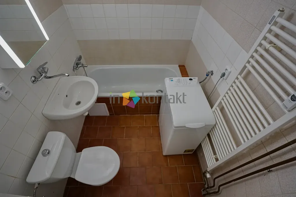 Byt je vybaven kuchyňskou linkou, lednicí, mikrovlnnou troubou, sklokeramickou varnou deskou a pračkou.