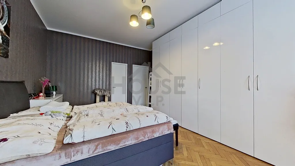 Byt se nachází ve 3. patře domu ze 30. let s výtahem a velkoryse řešenými byty, s vysokými stropy a velkými francouzskými okny, která zajišťují výjimečnou světlost všech obytných místností. Komfort bydlení podtrhují zachovalé dubové parkety ve všech pokojích a na svou dobu převratné stropní vytápění, které zajišťuje rovnoměrné a úsporné teplo bez rušivých radiátorů.