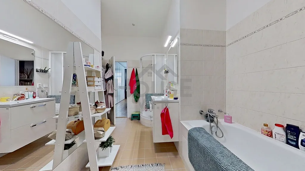 Byt disponuje prostornou koupelnou s vanou a sprchovým koutem. Na samostatné WC je vstup z předsíně. Zachovány jsou mnohé původní architektonické prvky, typické pro prvorepublikovou výstavbu, které dodávají bytu jedinečný charakter a noblesu.