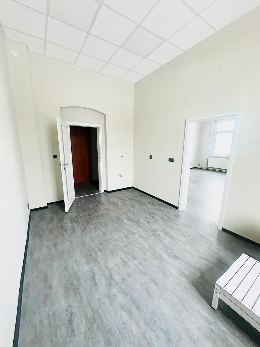 Interiér je světlý, s dostatkem denního světla, moderní podlahou a neutrálními barvami. Vytápění je řešeno radiátory, které jsou osazeny měřiči spotřeby, což umožňuje spravedlivé a přehledné vyúčtování energií. Prostor se nachází v klidné části budovy, má samostatné místnosti, chodbu a vlastní sociální zázemí (WC + umyvadlo).