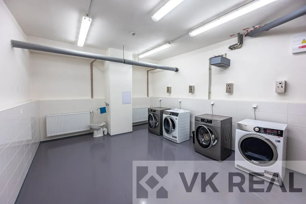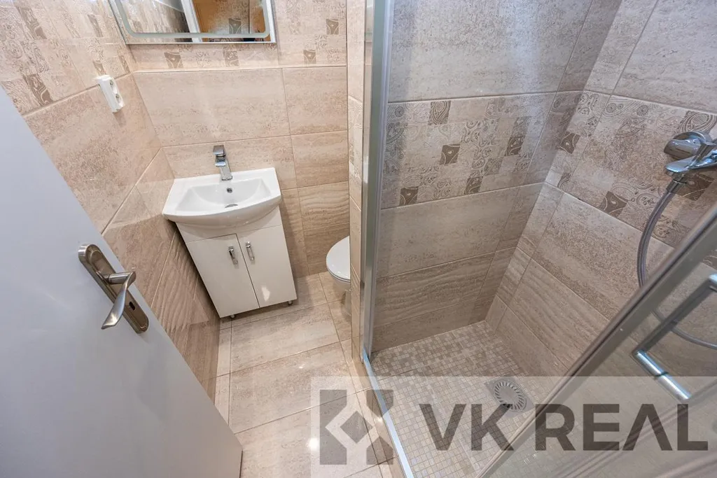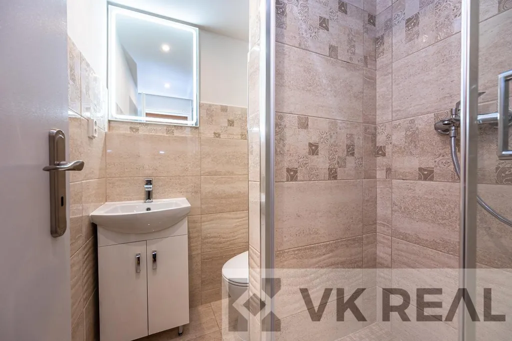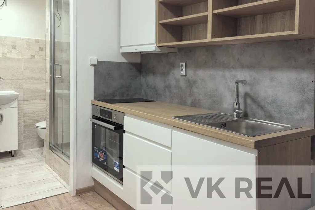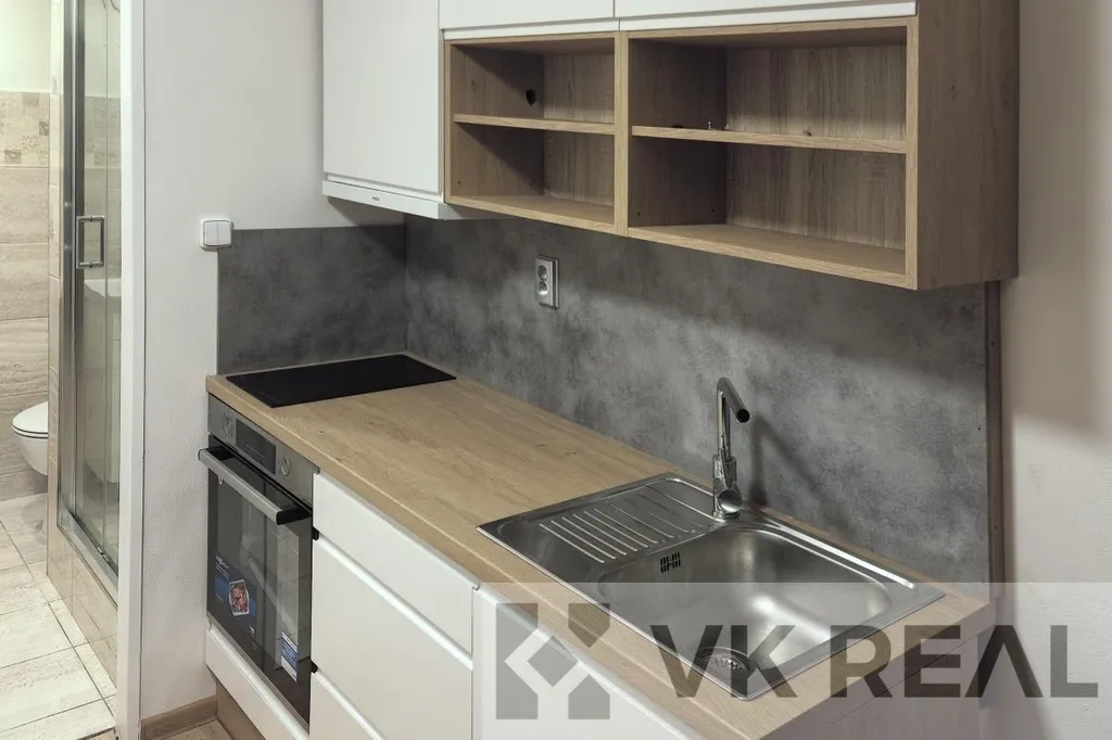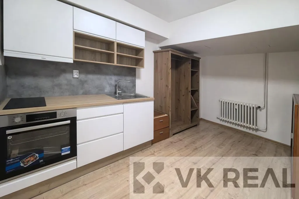 Prostor disponuje jednou hlavní místností s kuchyňskou linkou (indukční dvouvařič, elektrická trouba, odsavač s recirkulací, vyobrazená pračka není součástí prodeje), dále je zde vstup do koupelny se sprchovým koutem a WC. Na podlaze je položená plovoucí podlaha, koupelna a WC dlažba. Vše je nové, v podstatě nepoužité.