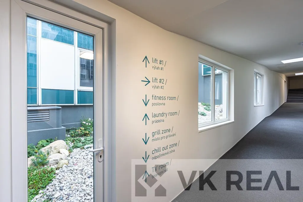 Vchod do nebytového prostoru je ze společné chodby v přízemí domu s 24 hodinovou recepcí. Skládá se z jedné místnosti (bez okna).
