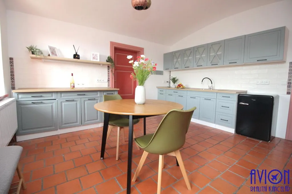 Ve velké kuchyni o rozloze 18 m2 se nachází jídelní stůl se židlemi, komoda, skříňky a dále dvoudílná velká kuchyňská linka včetně sporáku se sklokeramickou varnou deskou a lednicí. V koupelně o velikosti 9 m2 je vana, toaleta je oddělená.