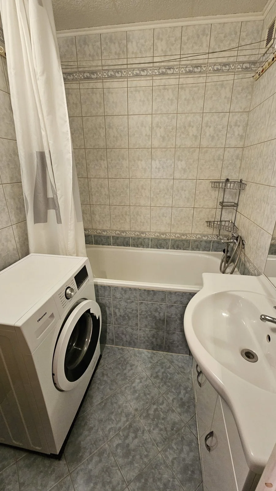 Koupelna s vanou, koupelnovou skříňkou a pračkou. WC je samostatné.
