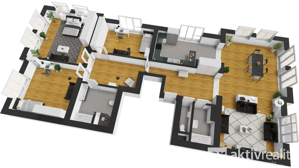 Byt je velmi světlý a pronájímá se vkusně a moderně zařízený. Místnosti jsou znázorněné v půdorysu a veškerý nábytek je vyrobený na míru. Nachází se zde obývací pokoj s jídelnou a kuchyňským koutem s veškerými spotřebiči Miele a Bosch. Dále jsou zde tři prostorné ložnice, chodba a hala s vestavěnou skříní, koupelna s vanou a toaletou, koupelna se sprchou, samostatná toaleta s umyvadlem.