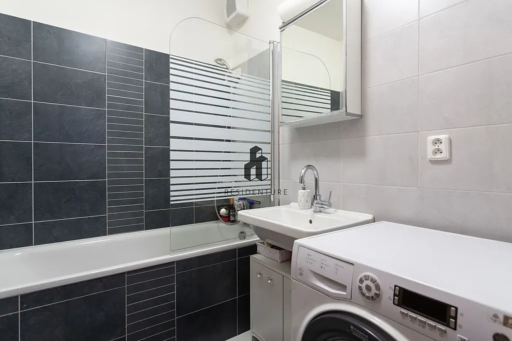 V předsíni (6,84 m²) je vstup do koupelny (3,77 m²) s vanou a pračkou a do samostatného WC (1,69 m²).