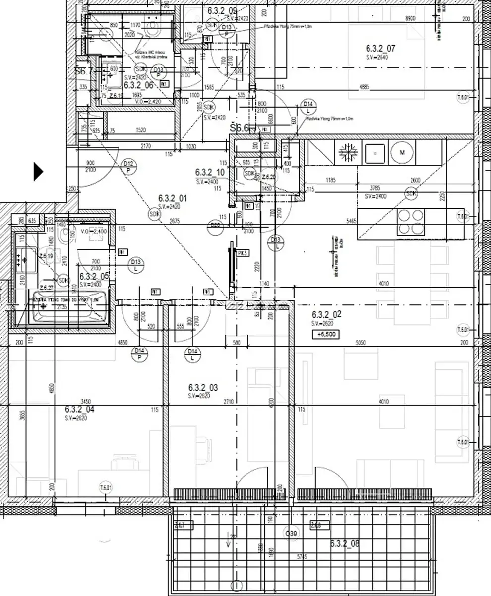 Byt je situován ve 3. nadzemním podlaží bytového domu s výtahem a nabízí prostornou a světlou dispozici s obytnou plochou 106 m2. Dispozičně se skládá ze vstupní chodby, vzdušného obývacího pokoje s jídelní částí a prostorným kuchyňským koutem se vstupem na terasu. Dále jsou zde tři světlé ložnice, z nichž jedna má vstup na balkon, dvě koupelny, samostatná toaleta a komora. K bytu náleží garážové parkovací stání a sklep.