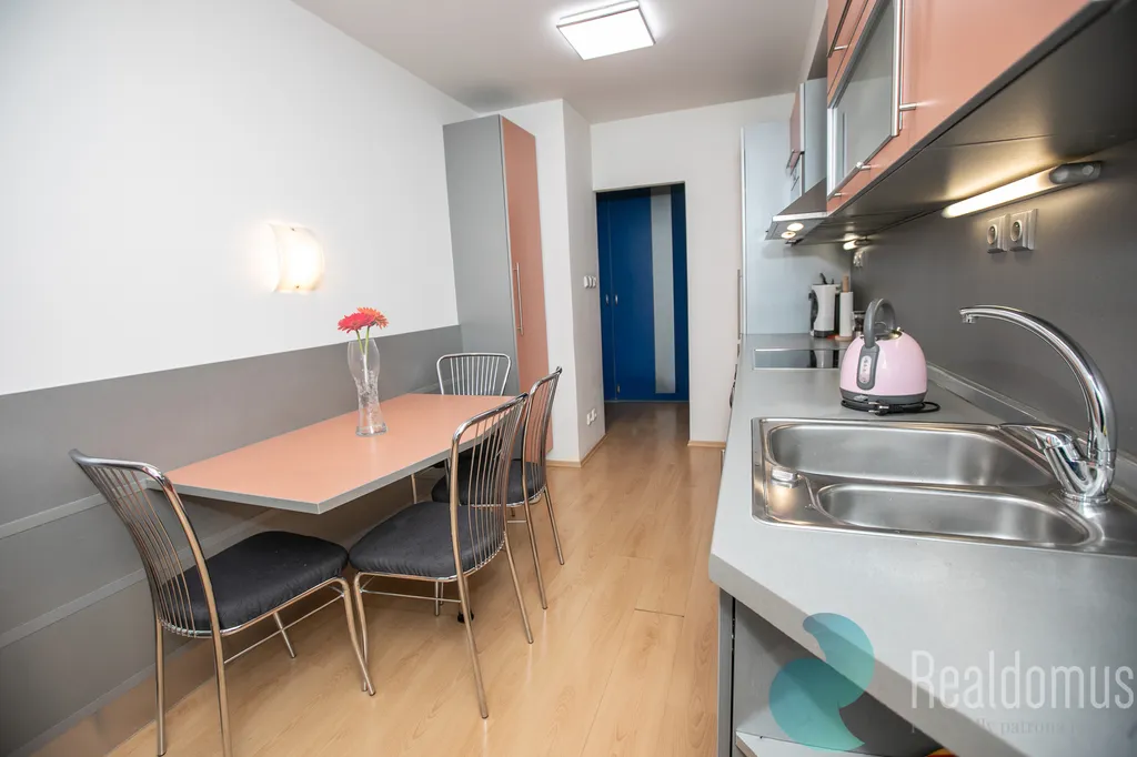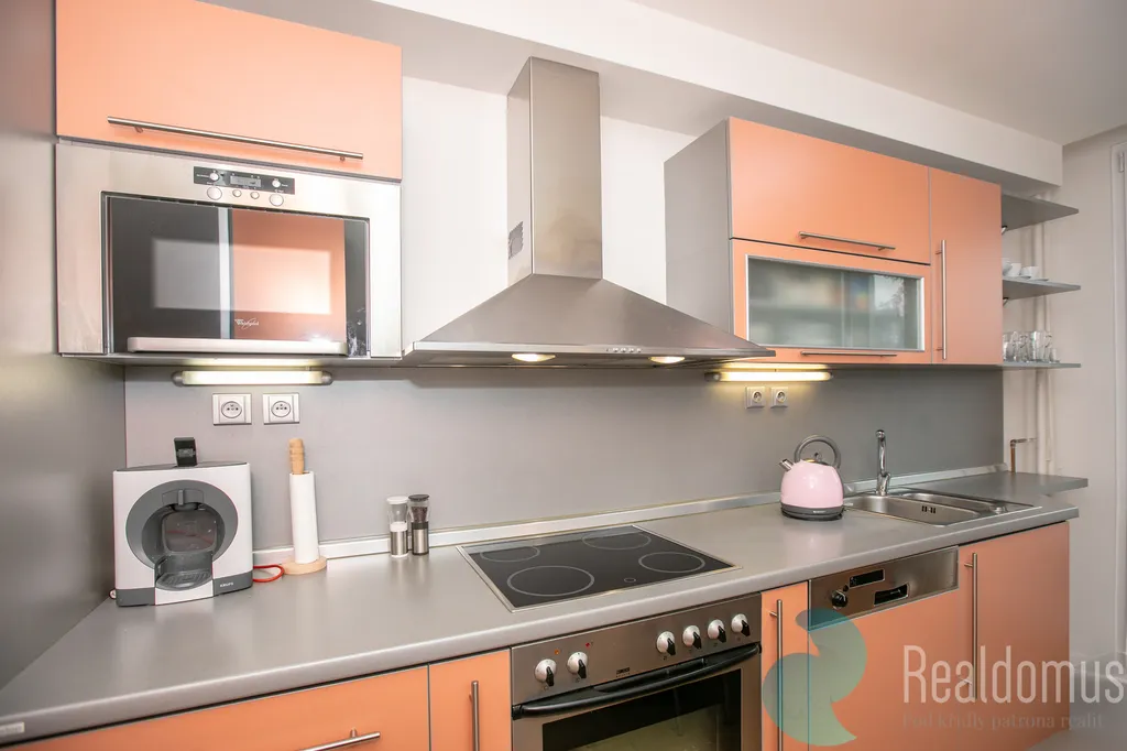 Kuchyň je moderně vybavená a nabízí přímý vstup na zasklenou lodžii, ideální pro ranní kávu nebo relax. Obývací pokoj s nábytkem na míru poskytuje dostatek prostoru pro odpočinek i rodinné setkávání.