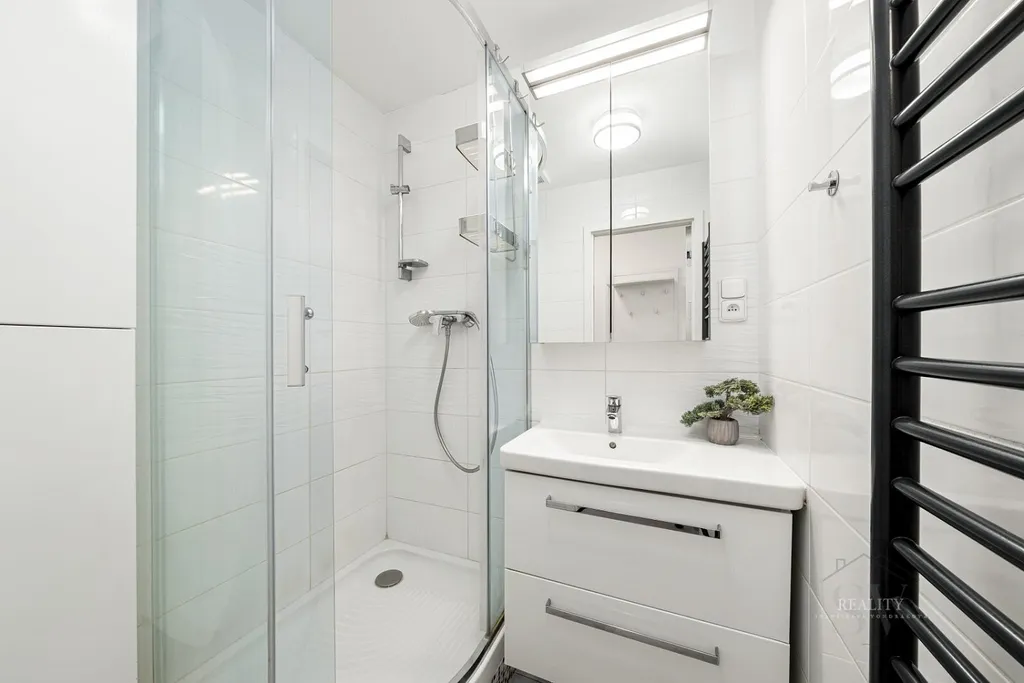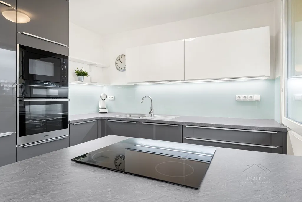 Interiér prošel precizní rekonstrukcí s důrazem na kvalitu materiálů, funkčnost a čistý design. Dominantou bytu je kuchyň na míru s ostrůvkem, vestavěnými spotřebiči, sklokeramickou varnou deskou a komínovým odsavačem. Ostrůvek nabízí i možnost barového sezení. Koupelna je řešena v moderním stylu se sprchovým koutem, toaleta je samostatná. V bytě jsou nové rozvody a elektroinstalace.