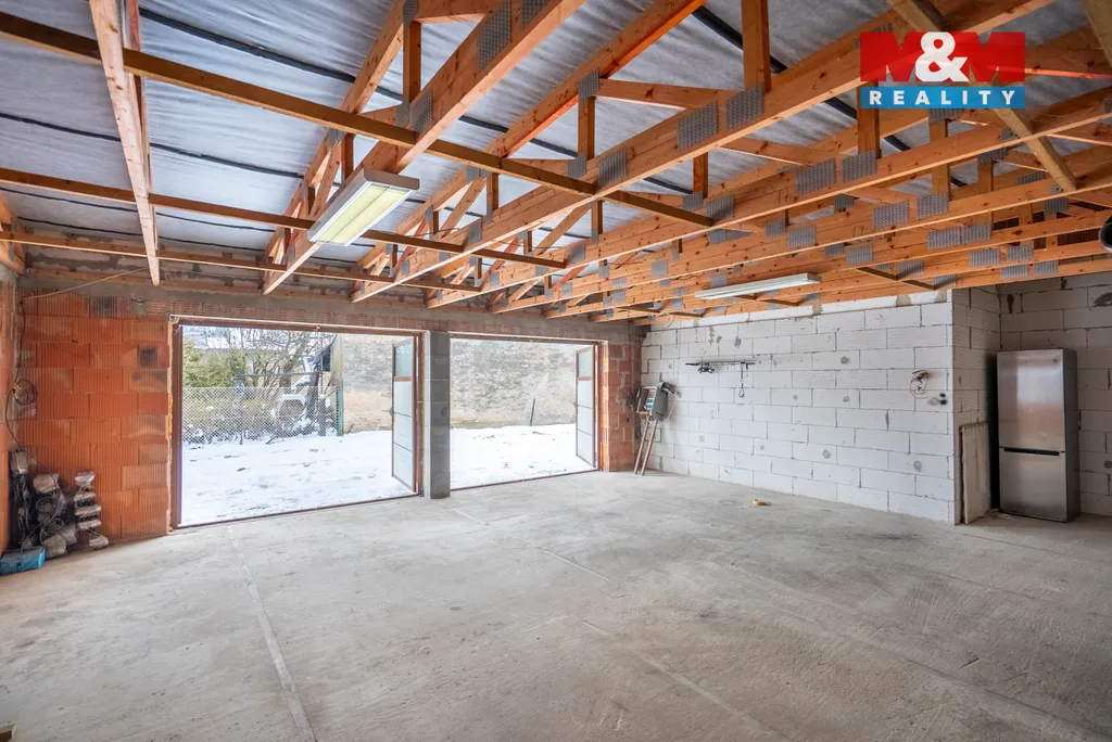 Velkým benefitem je navazující garáž o velikosti 66,7 m² se dvěma vjezdy, krbovými kamny a přípravou pro kuchyň - ideální také jako domácí dílna nebo prostor pro podnikání.
