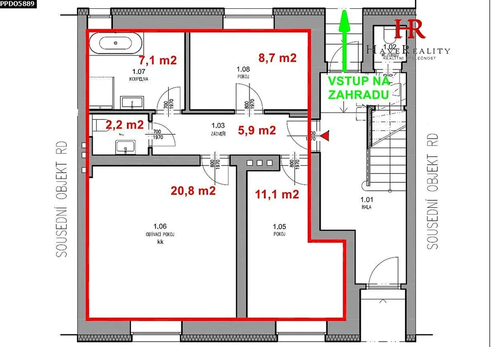 Podlahová plocha bytu je 61 m2, sklepa 7 m2, zahrada má výměru 74 m2.