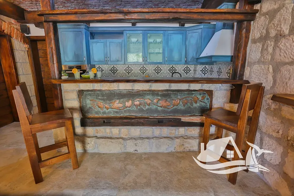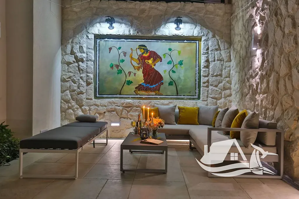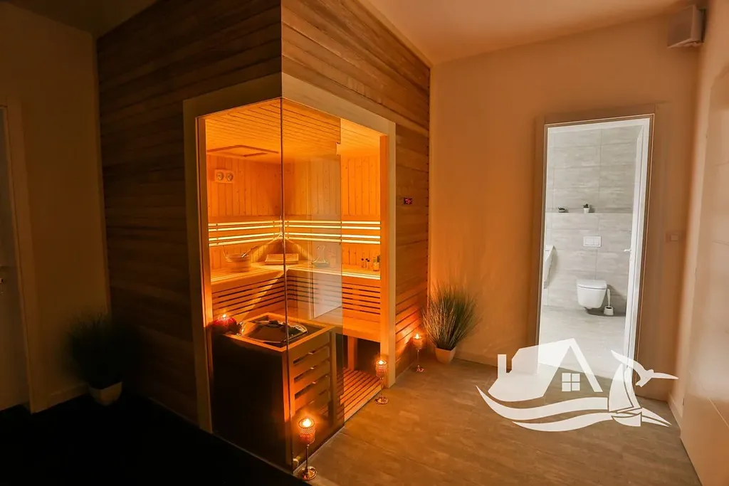 V přízemí o velikosti zhruba 100 m² se nachází tradiční konoba, wellness zóna se saunou, posilovna a místnost určená pro multimediální zábavu. Tento prostor plynule navazuje na velkou terasu s bazénem o rozloze 40 m² a pečlivě upravenou zahradu se středomořskou vegetací, palmami a venkovním grilem, která vytváří ideální zázemí pro odpočinek i společná setkání.