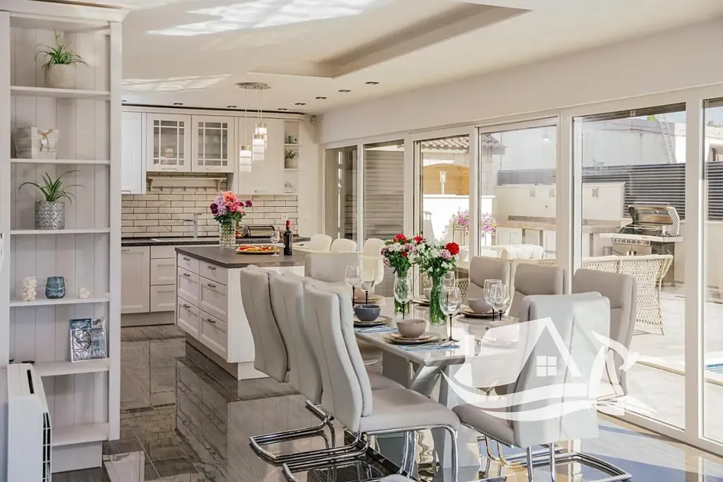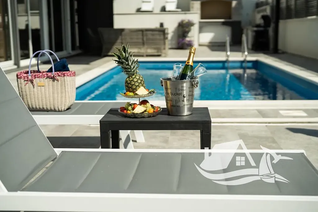 V přízemí vily se nachází prostorný obývací pokoj propojený s plně vybavenou kuchyní, tvořící otevřený a světlý obytný prostor. Odtud je přímý vstup na terasu a do dvora s bazénem a lehátky, který působí jako klidná soukromá oáza pro relaxaci během celého dne. Součástí exteriéru je také gril a venkovní jídelní kout, ideální pro dlouhé letní večery s rodinou nebo přáteli. Moderně řešená zahrada je pečlivě upravena a osázena středomořskou vegetací, která podtrhuje přirozený charakter celého místa.