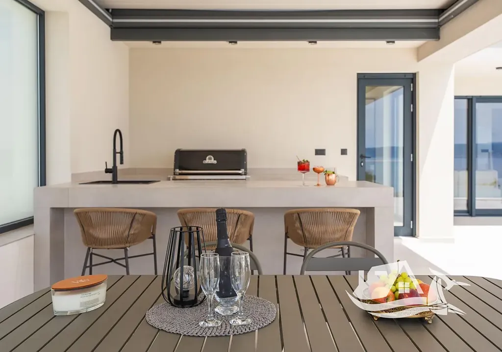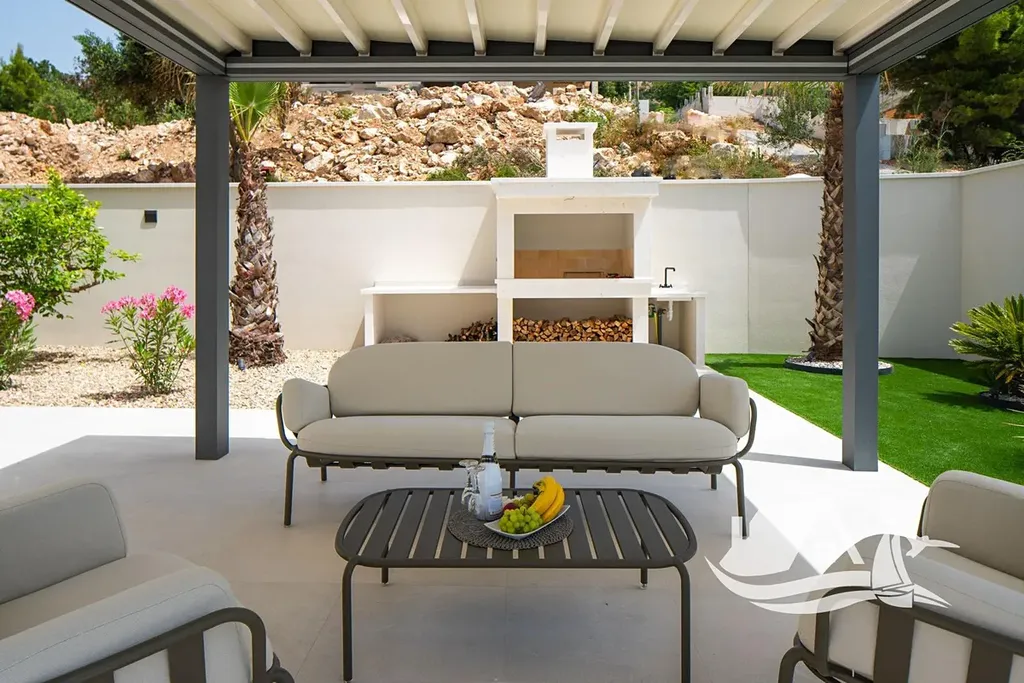 Součástí vily je bioklimatická pergola, která poskytuje stín i ochranu před povětrnostními vlivy, a venkovní kuchyně s plynovým grilem, ideální pro středomořský životní styl. Dům je navržen tak, aby byl komfortní jak pro celoroční bydlení, tak pro intenzivní sezónní využití.