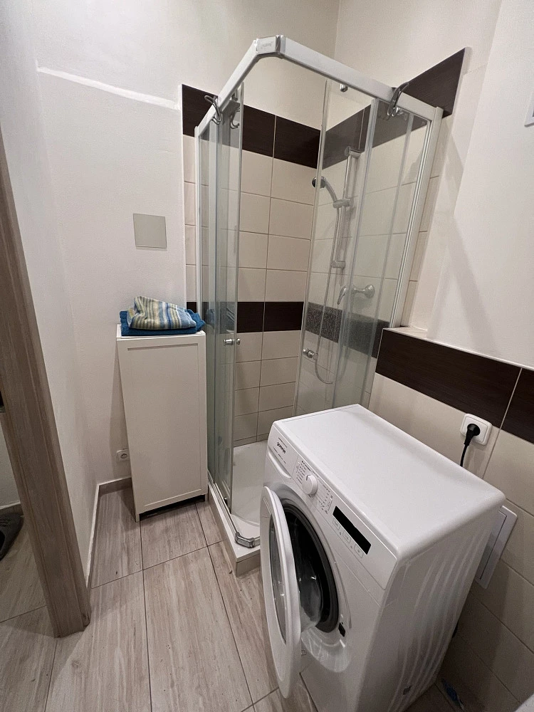 Z předsíně vstup do koupelny s WC, sprchovým koutem a pračkou.