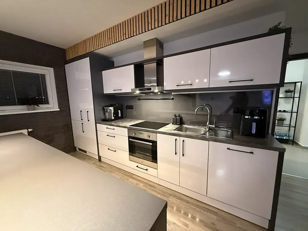 Bytová jednotka je vybavena zánovní prostornou kuchyňskou linkou s vestavěnou indukční deskou, el. troubou, mikrovlnnou troubou, digestoří, ledničkou s mrazákem a myčkou. V denních místnostech jsou laminátové plovoucí podlahy, v předsíni dlažba.