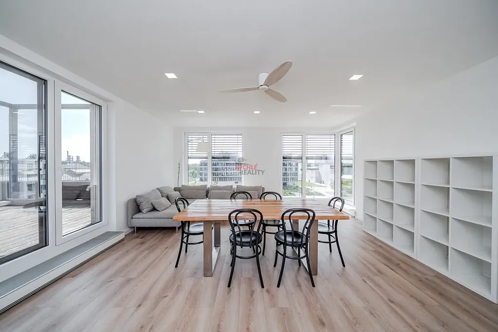 V bytě jsou pak další dvě samostatné ložnice, koupelna se sprchovým koutem, vanou i toaletou, další samostatná toaleta, komora (kde jsou umístěny pračka se sušičkou) a velkorysý obývací prostor s kuchyňským koutem se vstupem na terasu i lodžii.