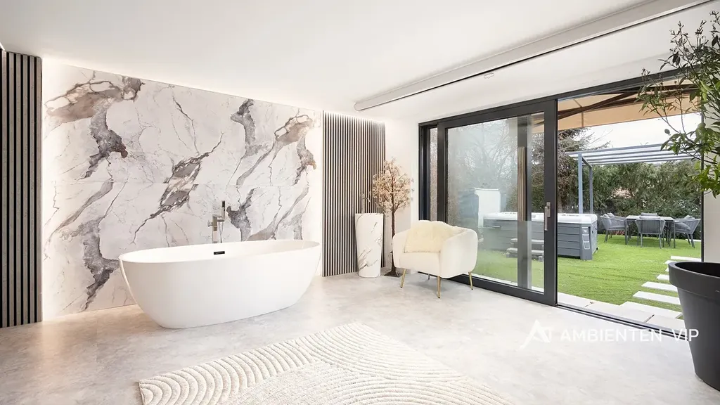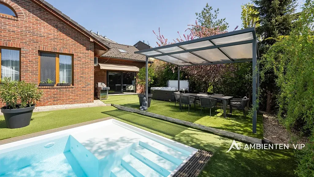 Tato vkusně a moderně zařízená vilka po rekonstrukci vás okouzlí nejen interiérem, ale i prostornou zahradou skýtající různé formy využití. Vstup do domu je přes prosklené zádveří, ze kterého vstoupíte do vzdušné světlé předsíně, která je obložená moderními panely s mramorovou texturou s velkorysým úložným prostorem a vstupem do téměř všech místností domu. Po levé straně naleznete průchod do prostorné šatny s ostrůvkem, přes kterou se prochází do luxusní ložnice. Ta má přímý výstup k bazénu a vířivce. Dominantou ložnice je na zakázku vyrobené dvojlůžko, samostatně stojící vana, umyvadlo a projektor s plátnem. Přímo z postele ložnice máte nádherný pohled do okrasné zahrady. Plátno projektoru lze využít i jako roletu. Otevřená dispozice obývacího pokoje, kuchyně a jídelny je příjemným prostor pro vaši rodinu. Kuchyňská linka je od firmy Mikyska. V rámci obývacího pokoje můžete spočinout na značkové sedačce, využít jídelní stůl s designovými židlemi či připravit pro rodinu výborné menu za pomoci moderních spotřebičů, většinou značky Miele. Za zmínku stojí varná část kuchyně nabízející Combi set pro pánev Wok a přípravu čerstvých paniny. Při přípravě pokrmů, stejně jako při relaxaci na sedačce můžete pozorovat život na zahradě, která obklopuje celý dům. Z obývací části je vstup na prostornou terasu až ke krytému bazénu se slanou vodou a protiproudem. Odpočinkovou zónu vkusně doplňuje vzrostlá středomořská vegetace v elegantních květináčích. Pokud se vydáte z předsíně vpravo, zavítáte do jednoho z dětských pokojů. V budoucnosti lze i tento pokoj propojit s terasou a přímým vstupem na zahradu. Vedle dětského pokoje se nachází technická místnost s pračkou a sušičkou a dále vstup do koupelny s toaletou a sprchovým koutem a dvěma umyvadly. Vytápění domu je přes plynový kotel Baxi. V přízemí domu je podlahové vytápění. Ve druhém patře domu se nachází dětský pokoj, který majitelka vkusně vyzdobila dětskou tapetou a vytvořila pohádkové království pro vaše děti. Celá zahrada je oplocená dřevěným plotem. Nabídne vám prostor, jak pro váš odpočinek, tak lze i část zahrady využít jako druhé stavební místo. Na pozemku máte soukromí, jelikož je zeleň v zahradě poměrně vzrostlá. Na zahradě se nachází domek na nářadí a herní plocha pro děti. Zdivo domu je cihla s obkladem Klinker. Okna jsou plastová s izolačním dvojsklem. Rodinný dům prošel nákladnou rekonstrukcí, která se uskutečnila v roce 2021 a 2024.
