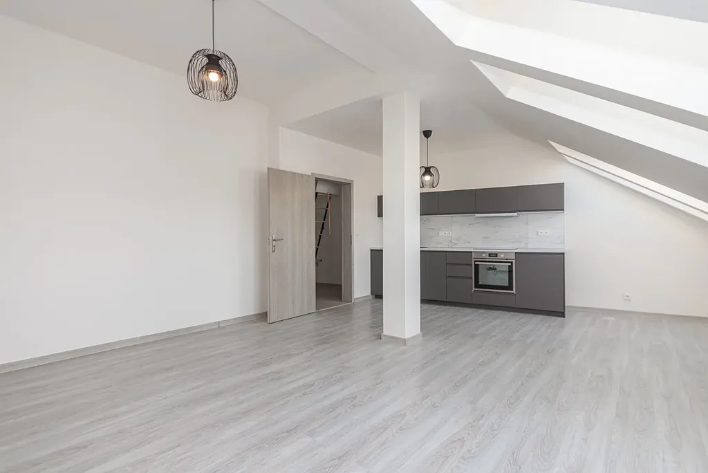 Kuchyňská linka je plně vybavena vestavěnými spotřebiči – indukční varnou deskou, elektrickou troubou, pračkou a lednicí s mrazákem, což zvyšuje komfort bydlení a činí byt ihned obyvatelným.