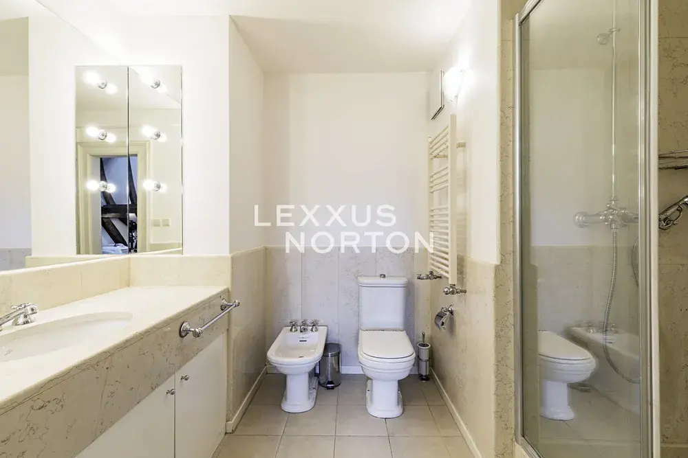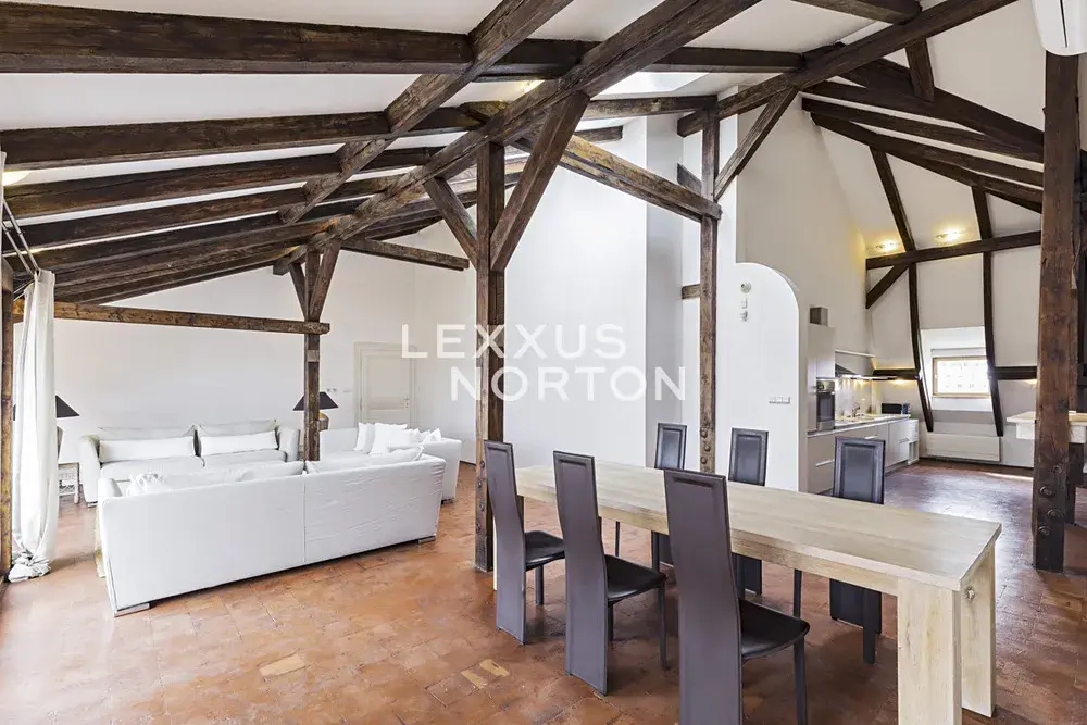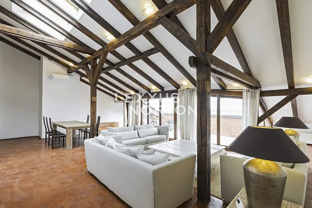 Tento byt nabízí k užívání vstupní chodbu, prostorný obývací pokoj s jídelním prostorem, samostatnou kuchyň, 3 ložnice, 3 galerie, 3 koupelny, samostatnou toaletu, prádelnu a komoru. K bytu náleží také terasa o velikosti 23 m2. Možnost pronájmu garážového parkovacího stání za poplatek 200 EUR/měsíčně.