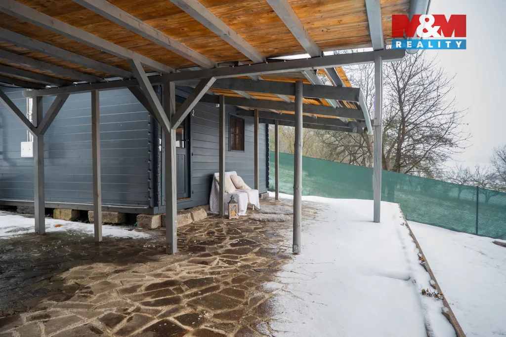 Nabízíme k prodeji útulnou chatu umístěnou do svažitého pozemku (608 m²) s nádherným výhledem do okolní krajiny.