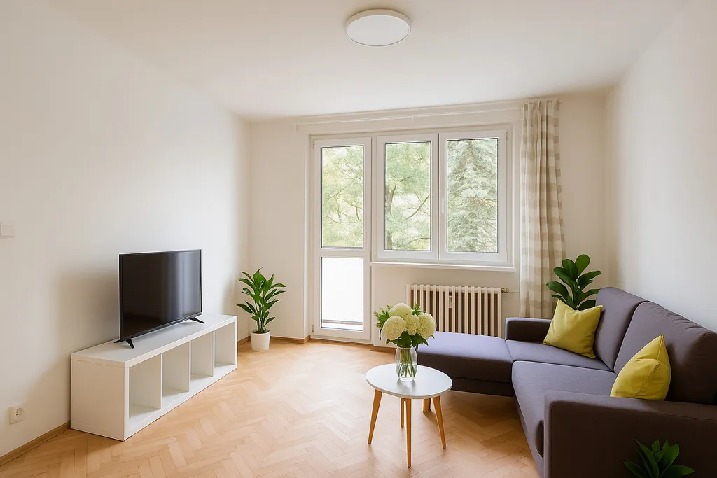Dispozice bytu nabízí prostorný obývací pokoj s přístupem na balkon, samostatnou ložnici, kuchyň, koupelnu, WC a vstupní chodbu. K bytu náleží sklepní kóje.